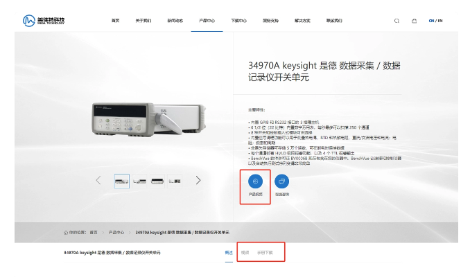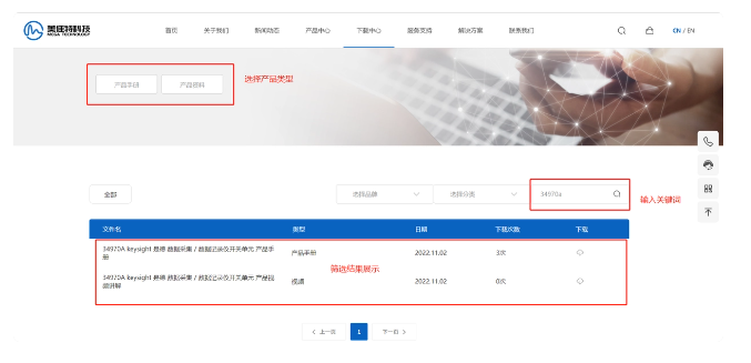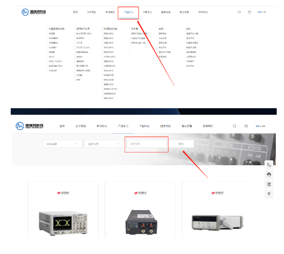 步驟二:點(diǎn)擊導(dǎo)航欄上“產(chǎn)品中心”,進(jìn)入產(chǎn)品中心頁面,輸入需要查詢的產(chǎn)品型號,例:34970A。點(diǎn)擊搜索即可