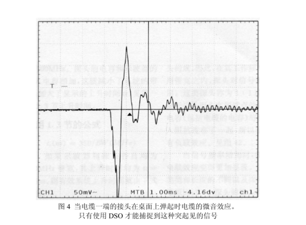 如果某一個(gè)事件只發(fā)生一次, 那么模擬示波器通常是不能應(yīng)付的。 而這正是DSO 展示其強(qiáng)大能力的時(shí)機(jī), DSO 能夠捕捉這種罕見的一次性事件, 并且按照你的的希望長(zhǎng)時(shí)間地將它顯示出來。這種罕見的事件甚至可能是干擾的結(jié)果, 通過用干擾本身來觸發(fā), DSO 具有顯示預(yù)觸發(fā)信息的能力, 包括顯示干擾的原因。圖 4 顯示的是當(dāng)電纜一端的開路接在桌面上彈起時(shí)電纜的微音效應(yīng)波形, 圖中觸發(fā)時(shí)刻用 Δ 符號(hào)來表示, 這個(gè)符號(hào)左邊的波形信息就是預(yù)觸發(fā)信息。
