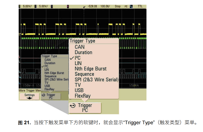 軟鍵常出現(xiàn)在未安裝 Windows 操作系統(tǒng)的示波器上(軟鍵圖片見圖 8)。 使用這些軟鍵可以導(dǎo)航示波器顯 示屏上的菜單系統(tǒng)。 圖 21 顯示了按下軟鍵時(shí)下拉菜單的樣子。 圖中顯示的是用于選擇觸發(fā)模式的菜單。 您可以連續(xù)按軟鍵進(jìn)行滾動(dòng)選擇,前面板上的有一個(gè)旋鈕,也用于滾動(dòng)選擇。 圖 21. 當(dāng)按下觸發(fā)菜單下方的軟鍵時(shí),就會(huì)顯示“Trigger Type”(觸發(fā)類型)菜單。