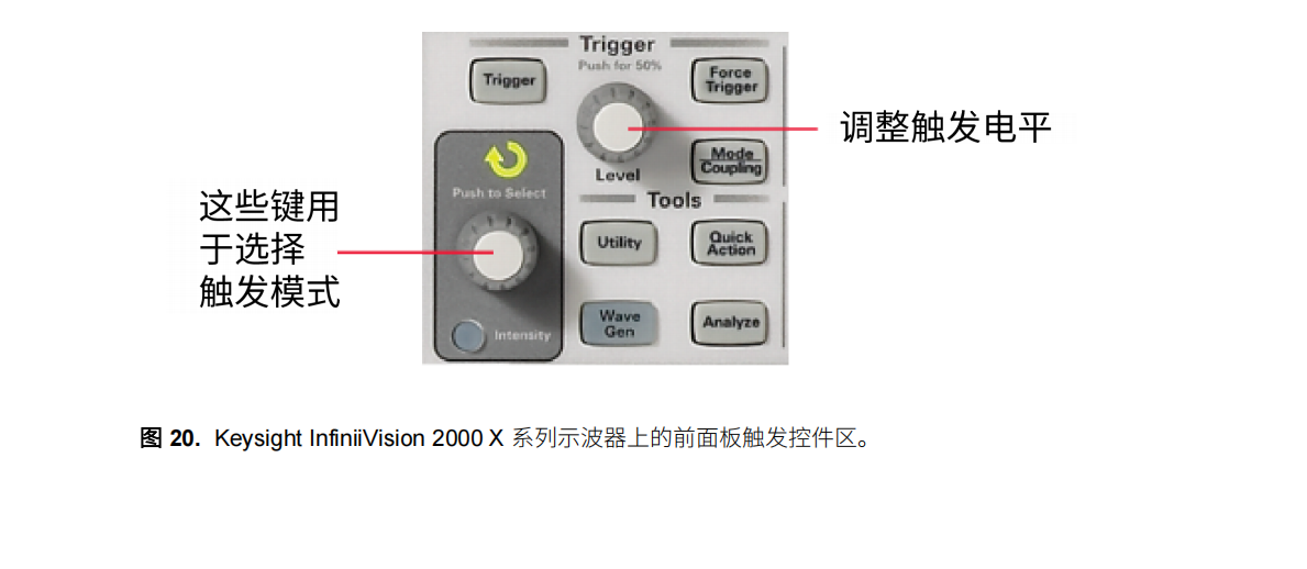 當(dāng)您需要找出特定的脈寬時(shí),脈寬觸發(fā)與毛刺觸發(fā)功能相似。 不過,通常您可以觸發(fā)任何指定寬度的脈 沖,并且可以選擇要觸發(fā)的脈沖的極性(負(fù)或正)。 您還可以設(shè)置觸發(fā)的水平位置。 這樣一來,您就可以 看清觸發(fā)前后的情況。 例如,您可以執(zhí)行毛刺觸發(fā),找出錯(cuò)誤,然后查看觸發(fā)前的信號(hào),以確定產(chǎn)生毛刺 的原因。 如果您將水平延遲設(shè)置為零,則觸發(fā)事件將被放在屏幕水平方向的中間位置。 在觸發(fā)之前發(fā)生的 事件將位于屏幕左側(cè),而在觸發(fā)之后發(fā)生的事件則位于屏幕右側(cè)。 您還可以設(shè)置觸發(fā)耦合,并設(shè)置想要觸 發(fā)的輸入源。 您不是必須要觸發(fā)自己的信號(hào),還可以觸發(fā)相關(guān)信號(hào)。 圖 20 顯示了示波器前面板的觸發(fā)控 件區(qū)。