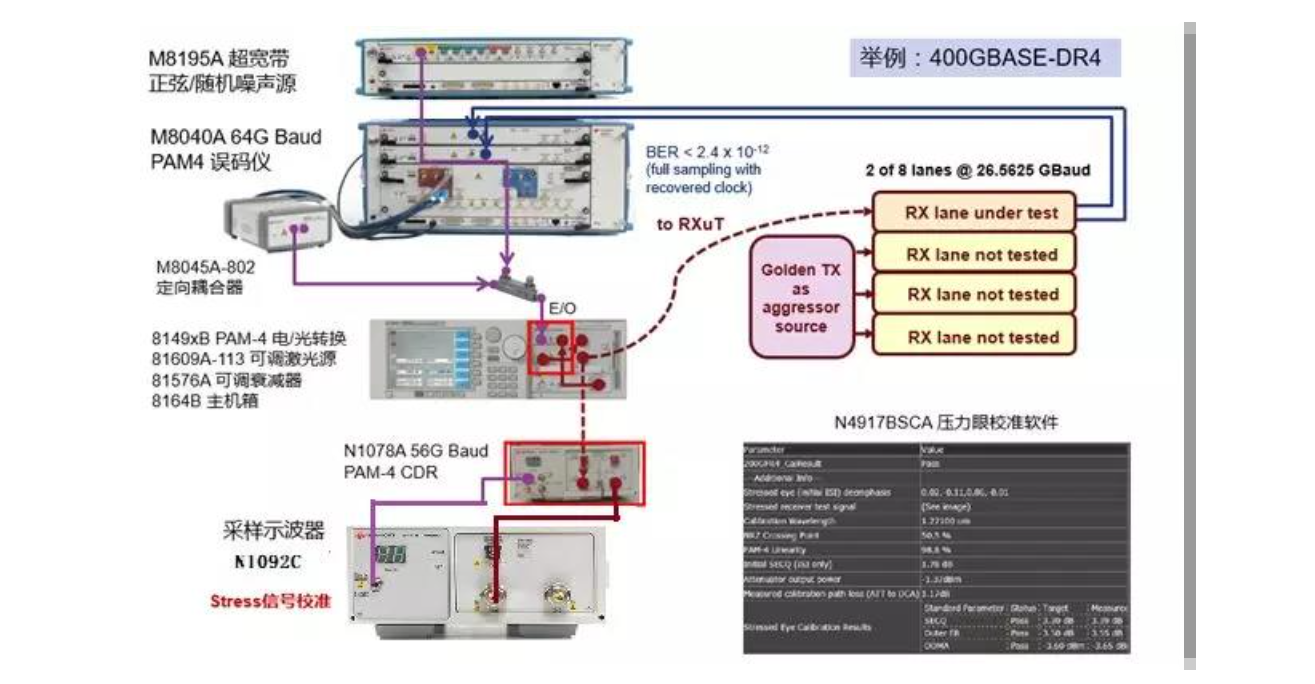 校準(zhǔn)后的光壓力信號(hào)輸入被測(cè)接收機(jī)的一個(gè)通道,被測(cè)接收機(jī)其余通道輸入正常通信的光信號(hào)。最后由被測(cè)光模塊環(huán)回電信號(hào)到誤碼儀的誤碼檢測(cè)口,或通過(guò)接收機(jī)內(nèi)部的誤碼統(tǒng)計(jì)功能進(jìn)行誤碼和壓力靈敏度等測(cè)試。下圖是400G-DR4光模塊的光壓力眼圖測(cè)試框圖,以及各部分對(duì)應(yīng)的測(cè)試儀表。