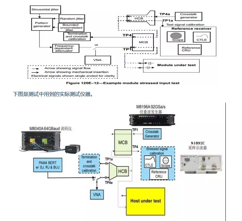 IEEE 802.3bs規(guī)范中對(duì)于光模塊的電輸入口的壓力容限測(cè)試方法描述如下:通過(guò)參考電發(fā)射機(jī)(通常是碼型發(fā)生器)以及抖動(dòng)注入源、碼間干擾源和串?dāng)_源,將壓力電信號(hào)輸入MCB夾具。之后將參考接收機(jī)(通常是示波器)通過(guò)HCB夾具與MCB夾具連接在一起,對(duì)壓力電信號(hào)進(jìn)行校準(zhǔn)。