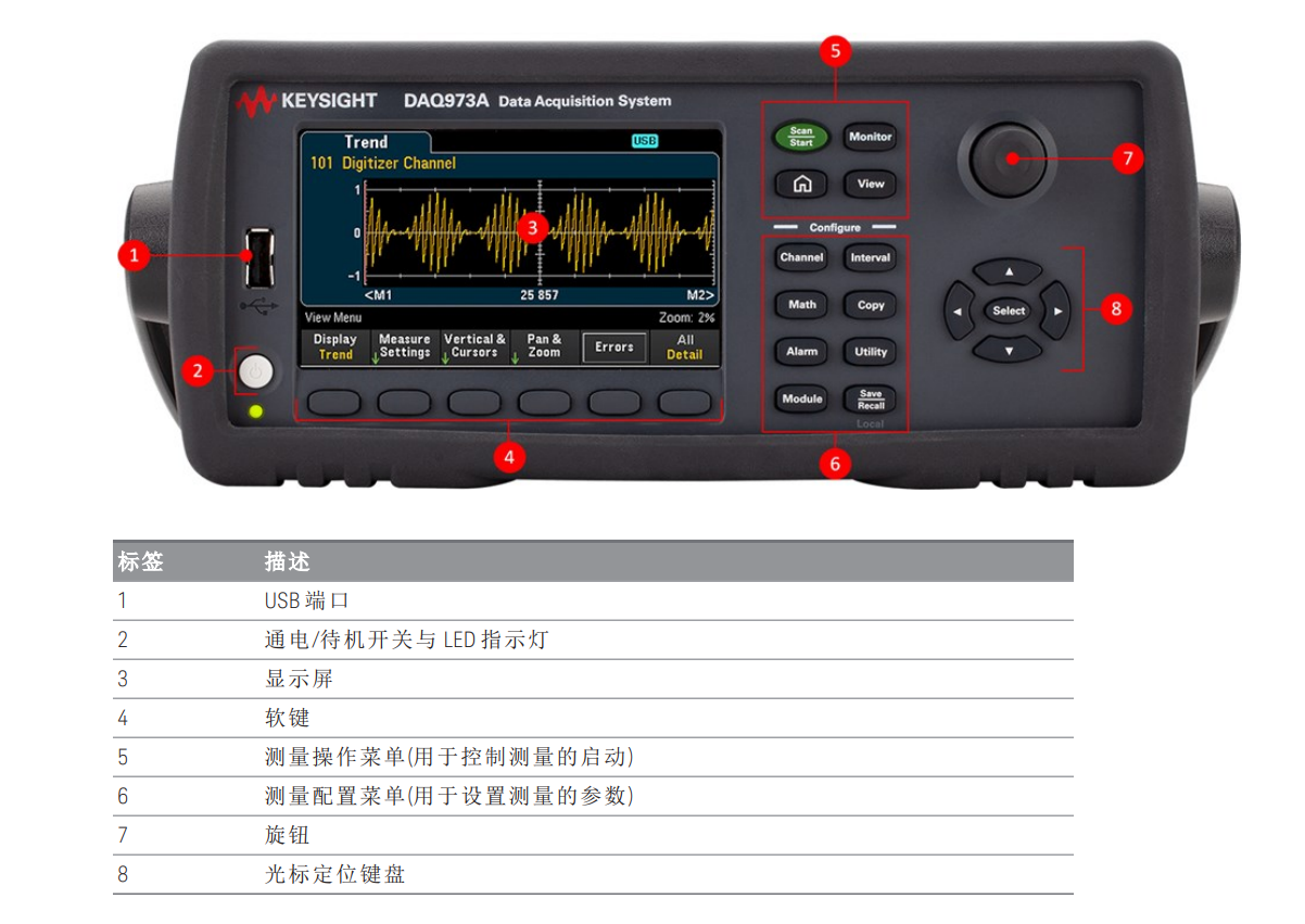 ? 簡單易用的操作界面:DAQ970A 數(shù)據(jù)采集系統(tǒng)擁有一個 4.3 英寸的大型彩色顯示屏,可以清晰地顯示數(shù)據(jù)和狀態(tài)。系統(tǒng)還具有一個直觀的圖形前面板,包括面向任務(wù)的自引導(dǎo)菜單,可以方便地進(jìn)行系統(tǒng)設(shè)置、通道配置、掃描控制、數(shù)據(jù)查看等操作。系統(tǒng)還支持 U 盤,可以輕松地在獨立應(yīng)用軟件中復(fù)制和記錄數(shù)據(jù)。