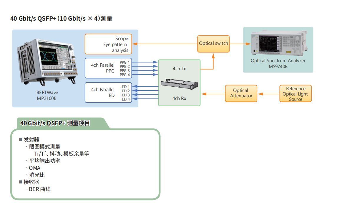 數(shù)據(jù)中心部署采用QSFP+等多通道光學(xué)模塊,以應(yīng)對(duì)數(shù)據(jù)流量的迅猛增長(zhǎng)。借助內(nèi)置的4通道BERT,MP2100B支持所有QSFP+通道的同步測(cè)量。此外,由于同時(shí)內(nèi)置BERT和示波器,因此還可以在執(zhí)行BER測(cè)量時(shí)監(jiān)測(cè)波形,從而將測(cè)試時(shí)間縮短近一半。