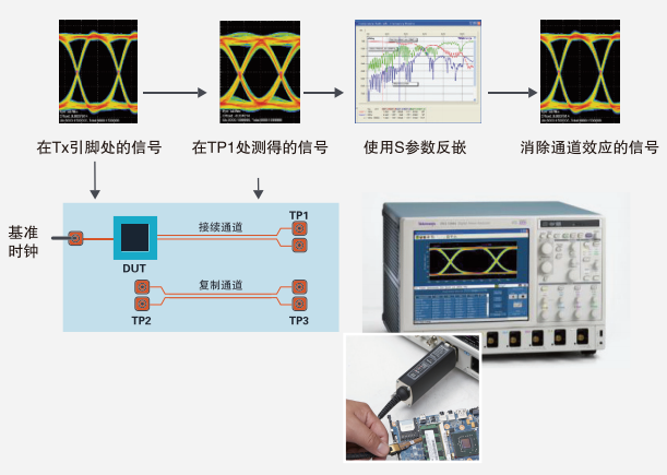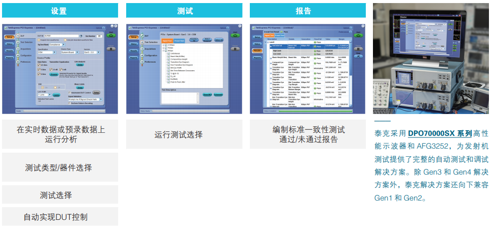 2. 使用軟件工具應(yīng)用通道均衡,測量和分析通道末端張開的眼圖。PCISIG 提供了一個(gè)軟件工具,稱為 SIG-Test,應(yīng)用與 PCI-SIG 特性有關(guān)的行為均衡器,提供測試通過 / 未通過結(jié)果。定制示波器軟件,如泰克 DPOJET 和 SDLA,可以從閉上的眼圖到張開的眼圖,全面表征和調(diào)試均衡的信號。