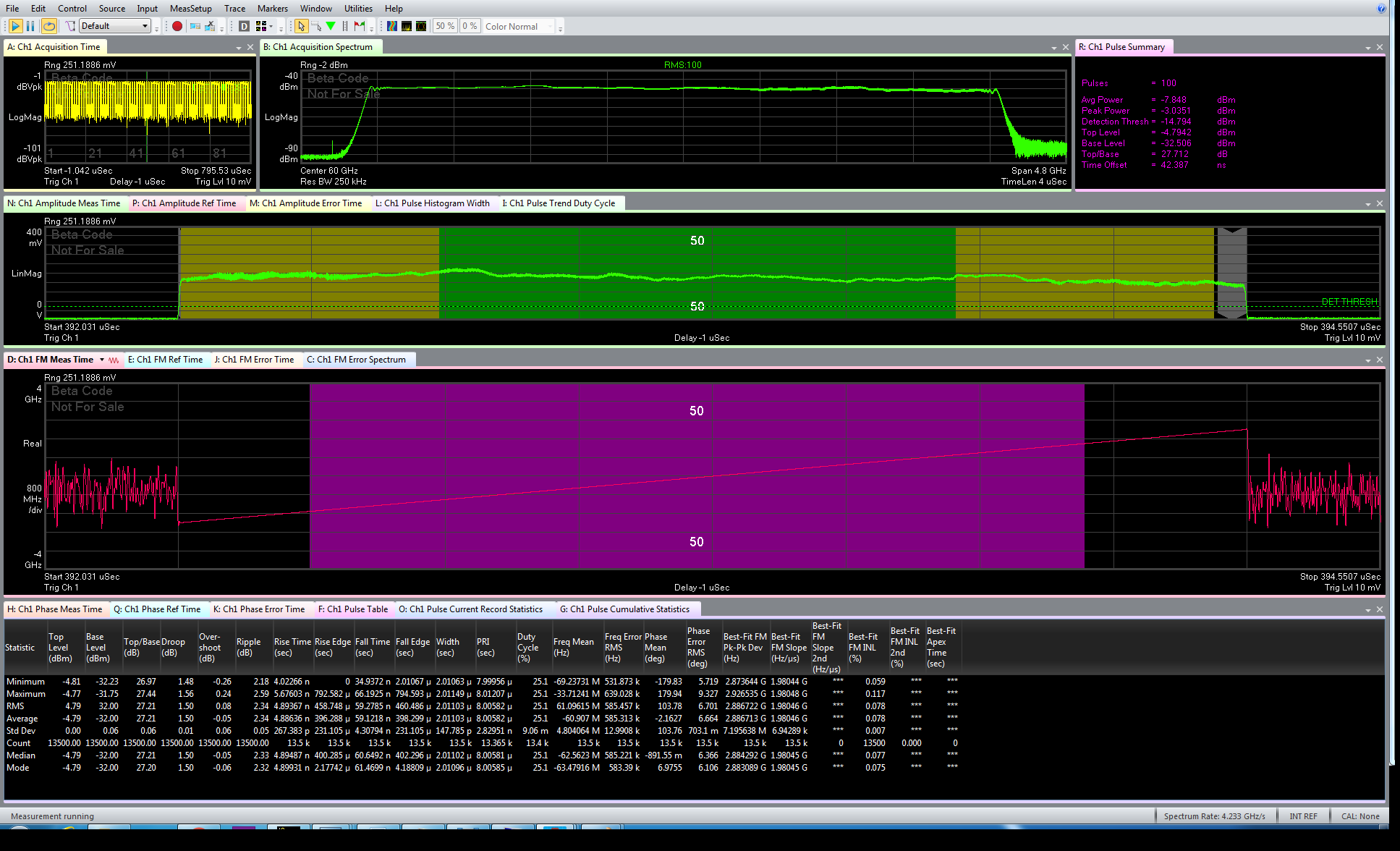 除了使用 VSA 89600 軟件 89601B/BN-BHQ 脈沖分析選件提供靈活的跡線疊加支持之外,還可以通過多個(gè)時(shí)間同步的幅度、相位和頻率 (FM) 跡線結(jié)果詳細(xì)查看脈沖信號(hào)調(diào)制特性和損傷誤差。與功率、下降、過沖、紋波、時(shí)間(上升/下降/寬度/PRI)、頻率、相位和 FM 調(diào)制相關(guān)的所有關(guān)鍵脈沖信號(hào)調(diào)制性能指標(biāo)都可以使用綜合脈沖表表格結(jié)果指標(biāo)進(jìn)行驗(yàn)證。