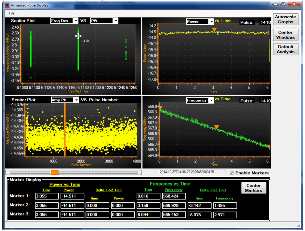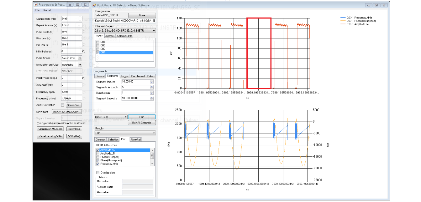 脈沖射頻檢測器軟件示例程序及其源代碼使用 GSA_SDK,并允許指定脈沖參數(shù)以僅捕獲感興趣的脈沖以進(jìn)行可視化。SDK 提供加速的標(biāo)準(zhǔn)脈沖測量,如上升/下降時(shí)間、PRF、PRI 等。