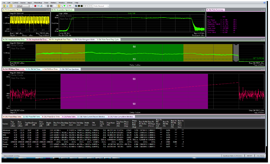 使用脈沖累積統(tǒng)計(jì)表、圖形直方圖和趨勢線跟蹤圖,可以快速查看每個(gè)報(bào)告的脈沖指標(biāo)的統(tǒng)計(jì)方差性能數(shù)據(jù),這些數(shù)據(jù)是在單次或多次采集中累積的。通過強(qiáng)大而靈活的跟蹤視圖(例如頻譜圖和累積歷史記錄)可以更深入地了解信號(hào)的時(shí)域和頻域動(dòng)態(tài)和雜散性能。