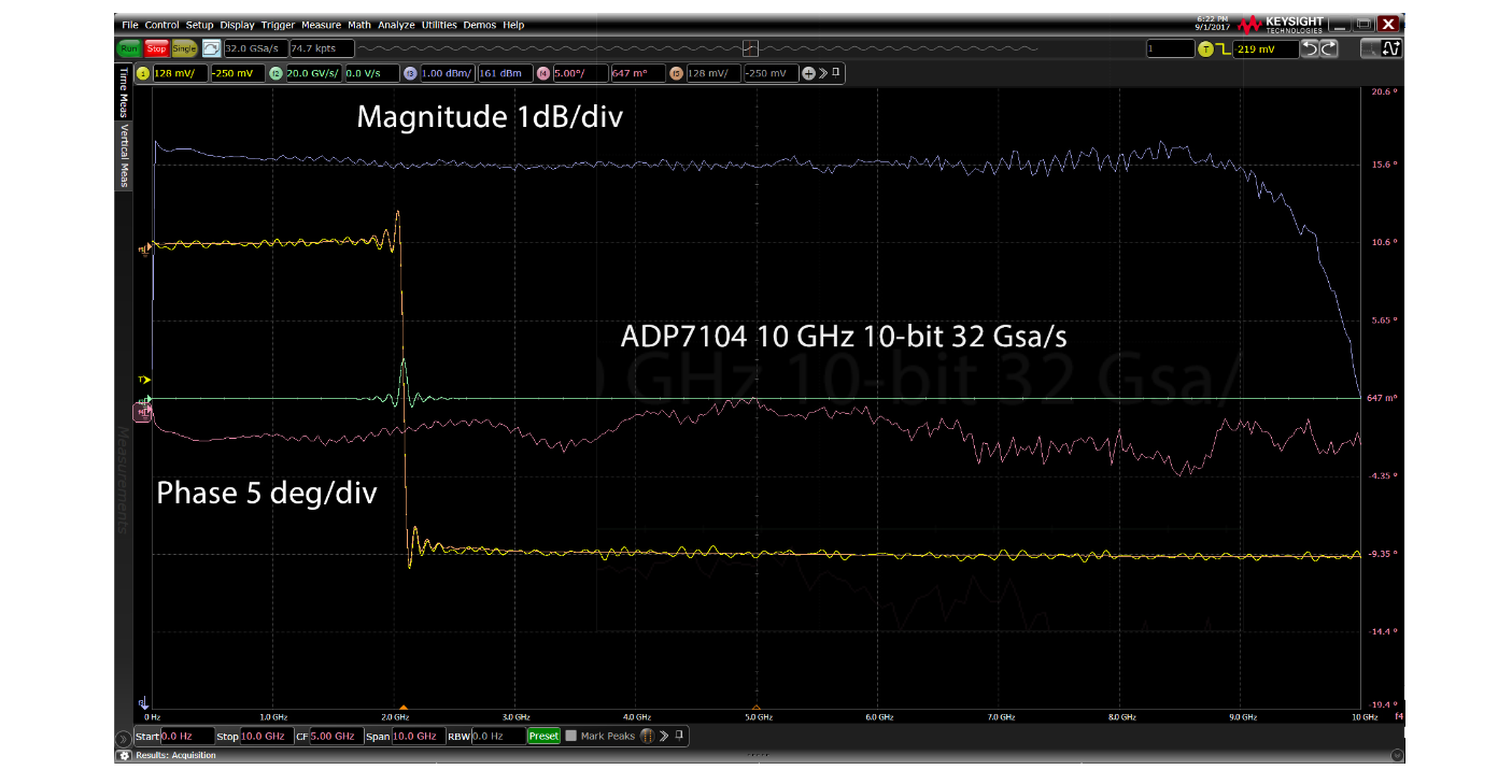 ADP7104 數(shù)字化儀具有出色的頻率響應(yīng)和相位響應(yīng),這對(duì)于寬帶雷達(dá)信號(hào)捕獲至關(guān)重要。獲得專利的群延遲測量與獲得專利的數(shù)字均衡[1][2]相結(jié)合,創(chuàng)建一個(gè)經(jīng)過校準(zhǔn)的基帶接收器,該接收器在 DC -10 GHz 頻段內(nèi)具有已知的幅度和相位響應(yīng),輸入信號(hào)范圍為 -32 dBm 至 +22 dBm。