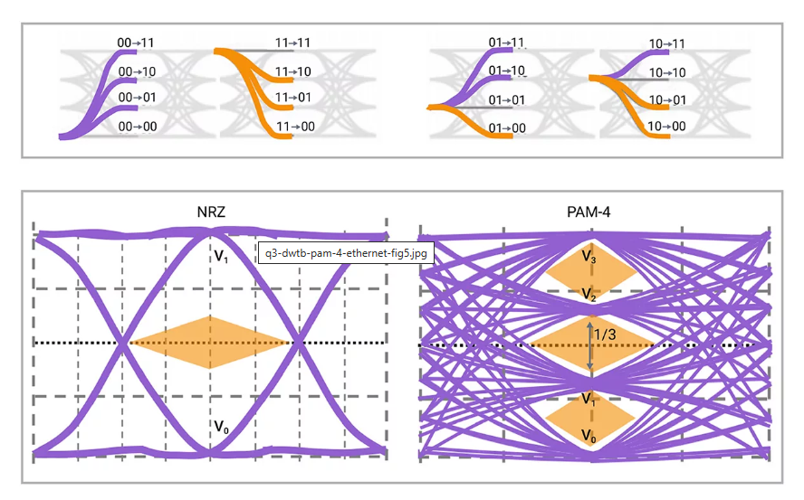 隨著互聯(lián)網(wǎng)的發(fā)展,數(shù)據(jù)中心和云計算的需求,網(wǎng)絡(luò)傳輸?shù)乃俣群蛶捯膊粩嗵岣?。目前?00G以太網(wǎng)已經(jīng)成為數(shù)據(jù)中心的主流標準,但是隨著5G、物聯(lián)網(wǎng)、人工智能等新技術(shù)的出現(xiàn),100G以太網(wǎng)已經(jīng)不能滿足未來的需求,400G以太網(wǎng)成為了新的目標。然而,要實現(xiàn)400G以太網(wǎng),傳統(tǒng)的NRZ(非歸零)信令已經(jīng)不夠用了,因為它的波特率(每秒傳輸?shù)姆枖?shù))和比特率(每秒傳輸?shù)谋忍財?shù))是相同的,也就是說,每個符號只能攜帶一個比特的信息。要想在相同的波特率下實現(xiàn)更高的比特率,就需要使用更高階的調(diào)制方式,例如PAM-4(4階脈沖幅度調(diào)制)信令,它可以在每個符號中攜帶兩個比特的信息,從而實現(xiàn)兩倍的比特率。因此,400G以太網(wǎng)改用PAM-4信令取代NRZ信令,是一種提高傳輸效率和降低成本的有效方法。