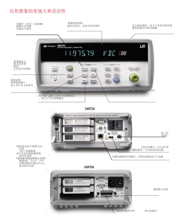34970A提供傳統(tǒng)的GPIB和RS-232接口,34972A內(nèi)置千兆位LAN和USB 2.0,因此你可以連接到現(xiàn)代PC上,而不必再去購(gòu)買其他設(shè)備。