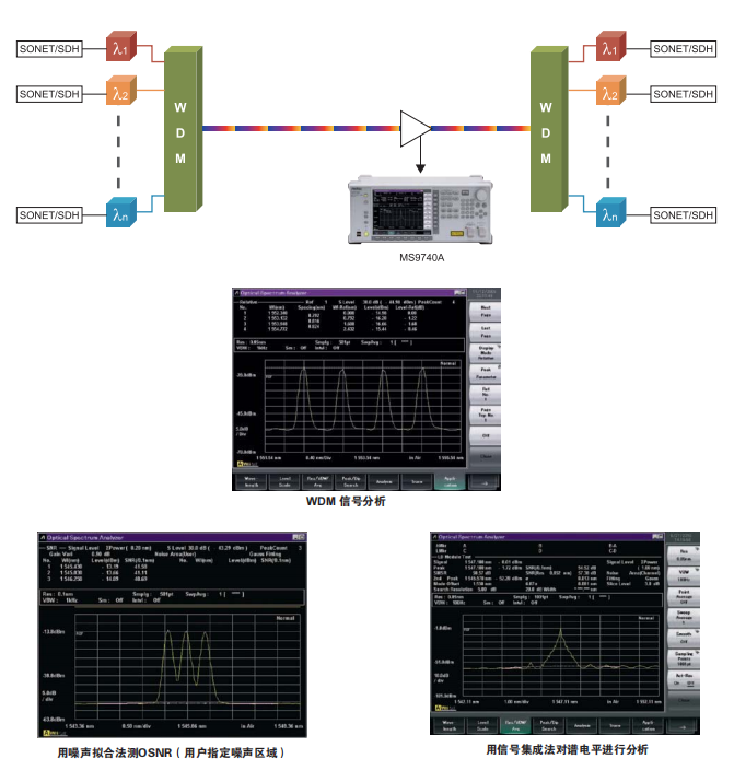 MS9740A在距峰值波長0.2nm外42dB的動(dòng)態(tài)范圍保證了100GH7和50GH7間隔WDM信號的精確測量。MS9740A最多可分析300個(gè)信道的信號,所有WDM 信號分析需要的信息如中心波長、功率、OSNR等都可以顯示在同一界面上。由于具有詳細(xì)的噪聲位置選擇,所以當(dāng)作OSNR分析時(shí),可以選擇兩種估算方法:兩點(diǎn)插入法和噪聲擬合插入法,兩點(diǎn)法可以自動(dòng)分析Dip點(diǎn),但是到中心波長的距離可以人為指定。