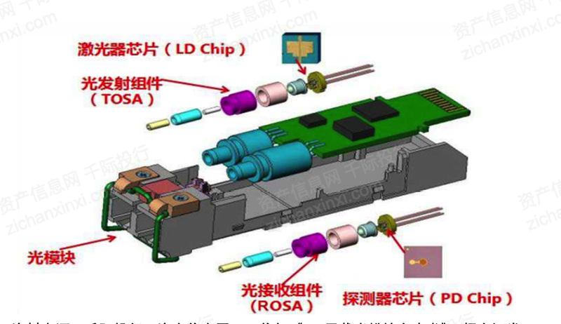 較高的技術壁壘和復雜工藝流程,光芯片在光模塊成本中占比較高。簡單來看,光芯片主要由光芯片、電芯片、光組件和其他結構件所構成,其中上游光器件元件是光模塊成本中的主要部分,在光器件元件中,光發(fā)射模塊TOSA和光接收模塊ROSA成本占比較高。TOSA的主體為激光器芯片(VCSEL、DFB、EML等),ROSA的主體為探測器芯片(APD/PIN等)。