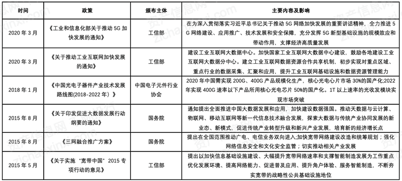 光模塊是現(xiàn)代信息光電子技術領域核心的光電子器件,應用較為廣泛,與數(shù)據(jù)中心、5G承載網(wǎng)的建設息息相關。因其重要性,我國政府頒布了一系列相關政策,支持光模塊產(chǎn)業(yè)的可持續(xù)發(fā)展。在2020年3月,工信部發(fā)布《關于推動工業(yè)互聯(lián)網(wǎng)加快發(fā)展的通知》,建設工業(yè)互聯(lián)網(wǎng)大數(shù)據(jù)中心。建立工業(yè)互聯(lián)網(wǎng)數(shù)據(jù)資源合作共享機制,初步實現(xiàn)對重點區(qū)域、重點行業(yè)的數(shù)據(jù)采集、匯聚和應用,提升工業(yè)互聯(lián)網(wǎng)基礎設施和數(shù)據(jù)資源管理能力。