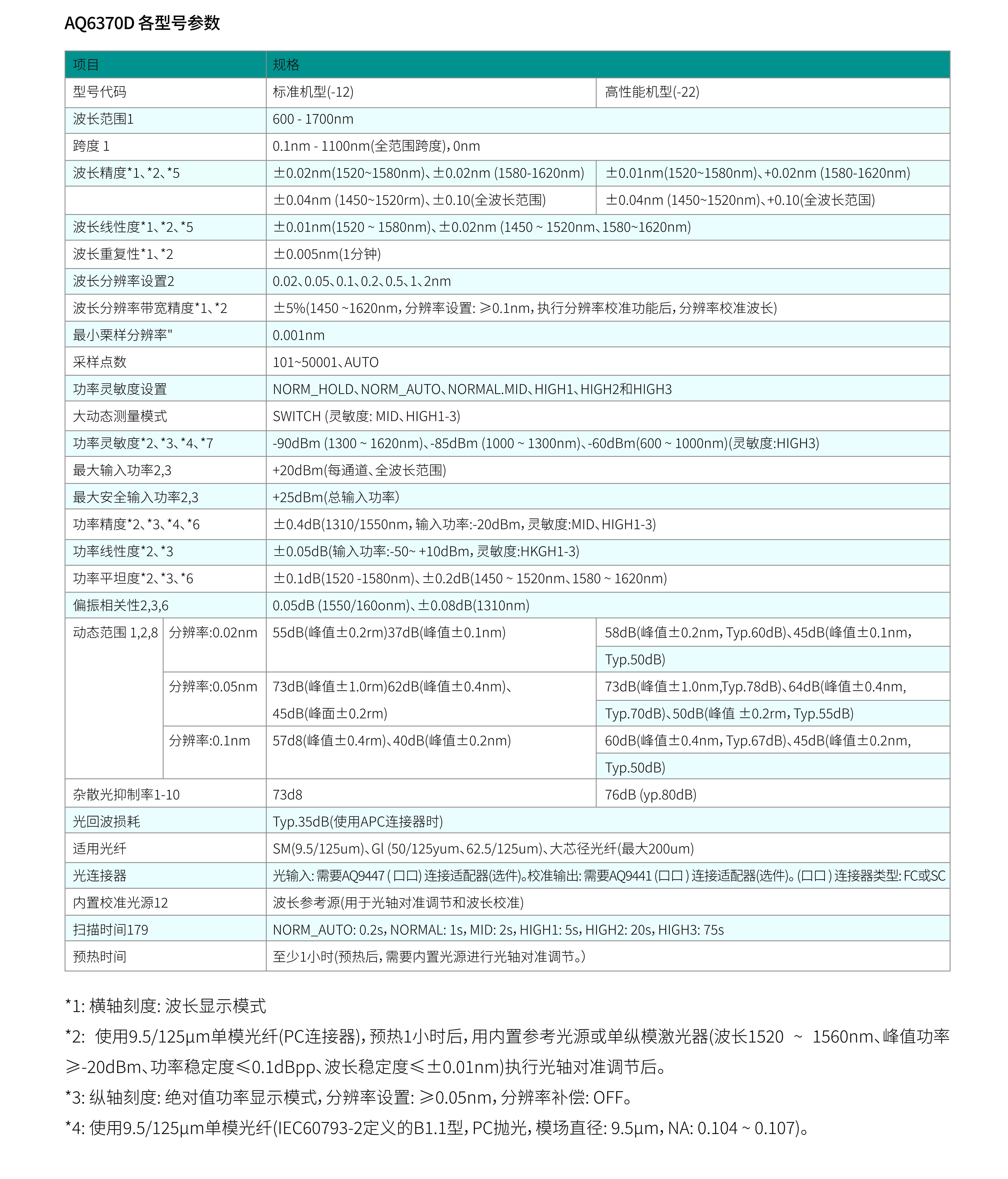 AQ6370D共有2種機(jī)型,分別是標(biāo)準(zhǔn)版和高性能版。高性能版可以提供的波長(zhǎng)精度更高、動(dòng)態(tài)范圍更大。