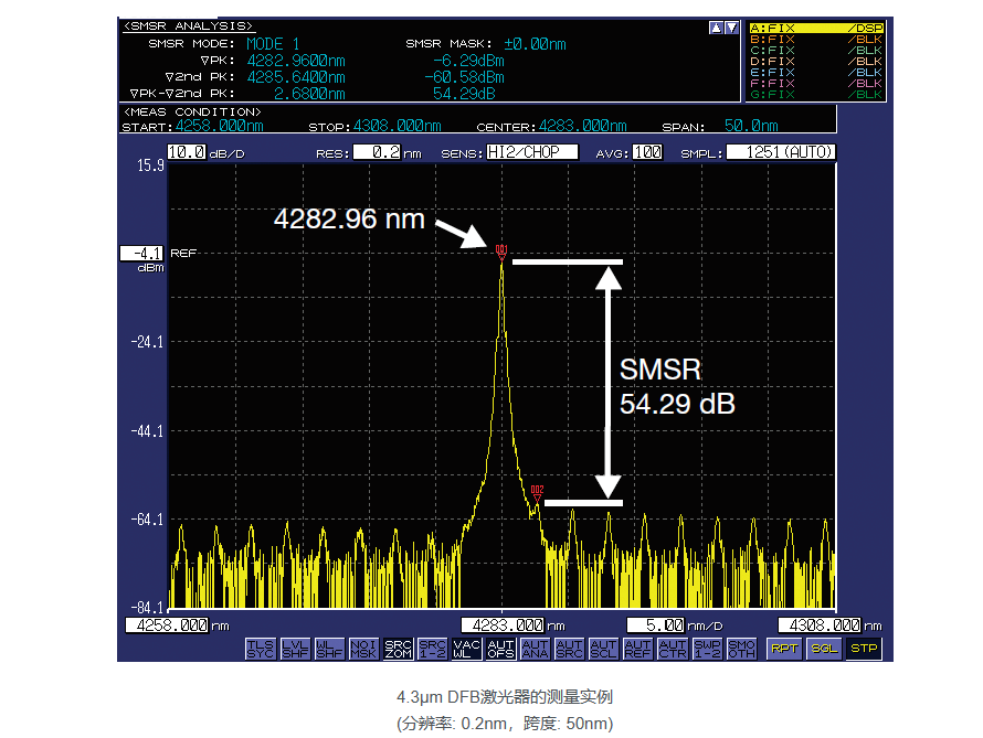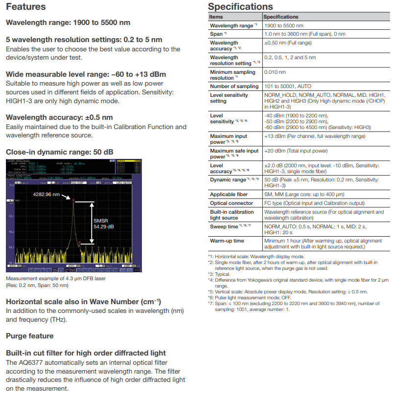 AQ6377具有73 dB的功率動態(tài)范圍和50 dB的近距離動態(tài)范圍,比在5μm波段工作的干涉儀型儀器的功率動態(tài)范圍大2000倍,近距離動態(tài)范圍大10倍。AQ6377能夠評估半導(dǎo)體激光器的邊模抑制比特性,市場上尚無其它如此高性能的同類設(shè)備 。