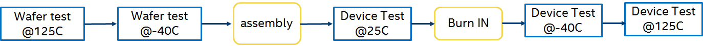 芯片根據(jù)應(yīng)用領(lǐng)域,溫度和可靠性要求的不同,需要定義不同的test insertion。比如汽車電子的產(chǎn)品測試流程如下共有5個test insertion,如此多的test insertion是因為汽車電子的DPM要求zero defect,必須在不同溫度下多次測試最大限度地篩選新品。